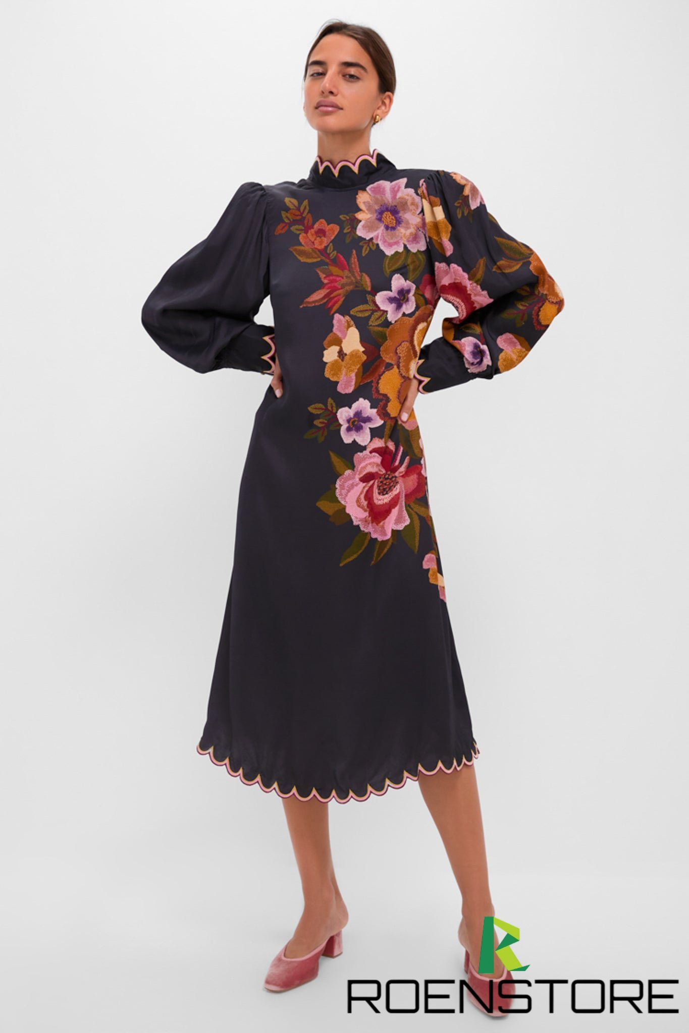 The Black Chenille Flowers Dress features bold floral detailing along the front, scalloped edges at the neckline, cuffs, and hem, and voluminous blouson sleeves. Perfect for weddings, dinner parties, or evening occasions, style it with heels and minimal jewelry for an effortlessly elegant look.